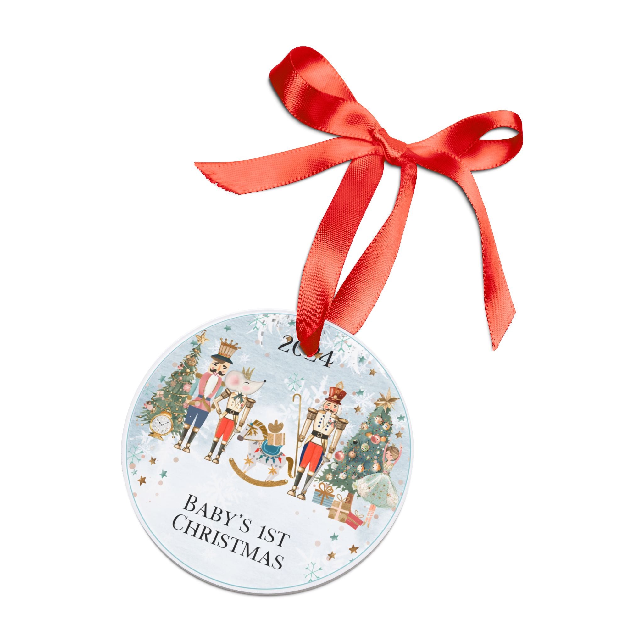 100% Acrylic Round Ornament with a picture of the Nutcracker in blue. States "Baby's 1st Christmas" on the front, and personalized your child's name in the back.