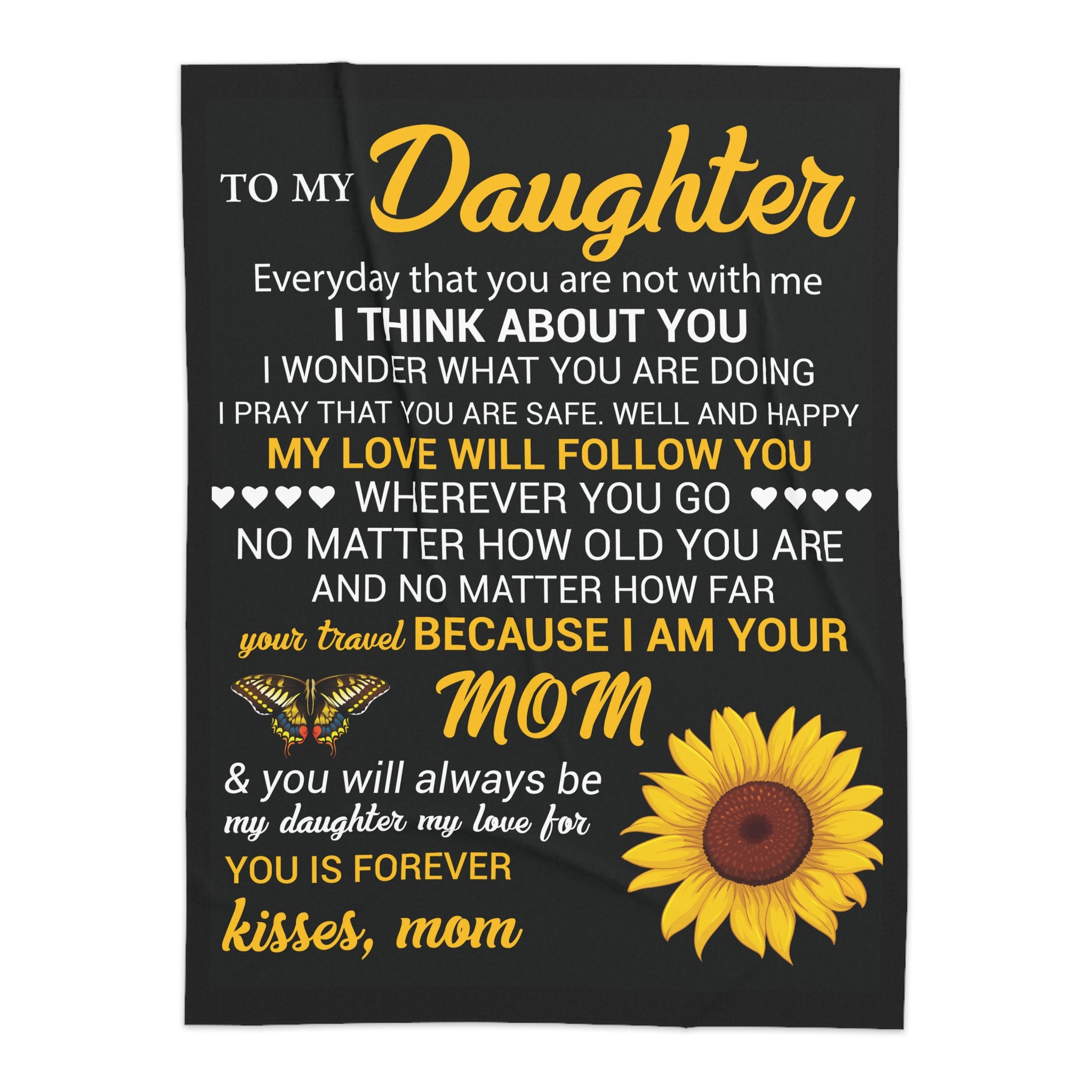 Dive into the realm of luxury with our specially crafted Sherpa blanket. The vibrant and detailed sublimation printing ensures that every nuance of your custom ideas shines brilliantly, capturing sharp details from edge to edge. Created with 100% polyester printed mink and backed by a 430 gsm ultra-soft sherpa lining, the blanket is the epitome of pure comfort. Select between two inviting sizes: a snug 50" x 60" or the generously sized 60" x 80" for a fuller embrace. Note that the plush sherpa side displays an elegant off-white shade, offering a tasteful contrast to the personalized design. With a hearty thickness of 0.6'' (15mm), it's the perfect shield against cold evenings and a companion for cozy mornings. Gift this symbol of love, and let it be a reminder for her, of your devotion and support for the rest of your days. More than just a blanket, it's a promise from Mom that she can wrap herself in and take along for each milestone of her life.