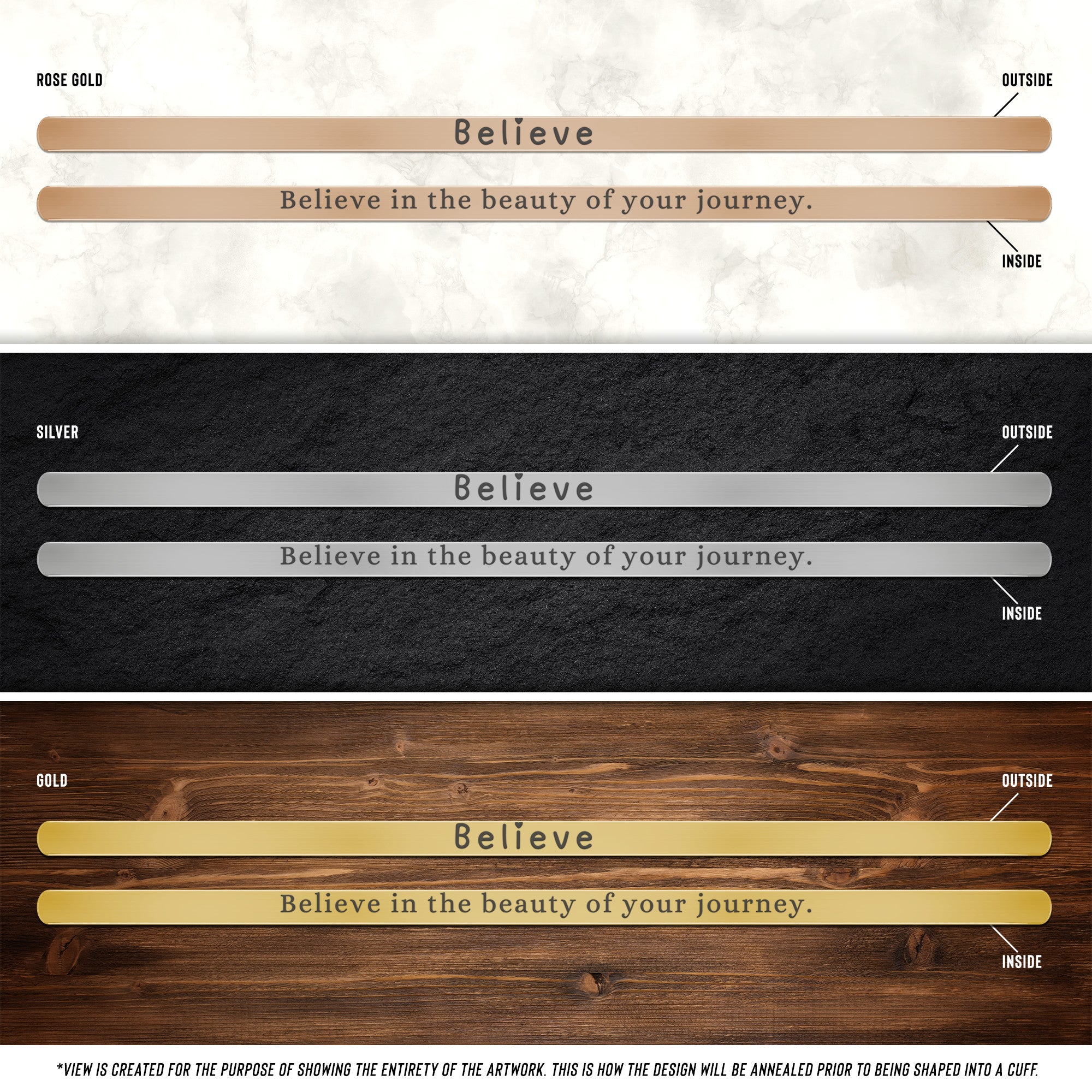 Inside our beautiful "Believe" cuff reads, "Believe in the beauty of your journey." Introducing our stylish cuff bracelet - the perfect addition to your jewelry collection. Made from high-quality stainless steel and finished with 18K Gold, Rose Gold, or Silver plating, this bracelet is not only elegant but also built to last. It will never fade, rust, tarnish, or corrode, ensuring you can enjoy it for years to come.