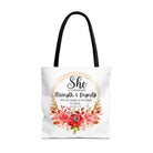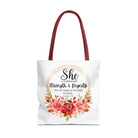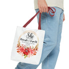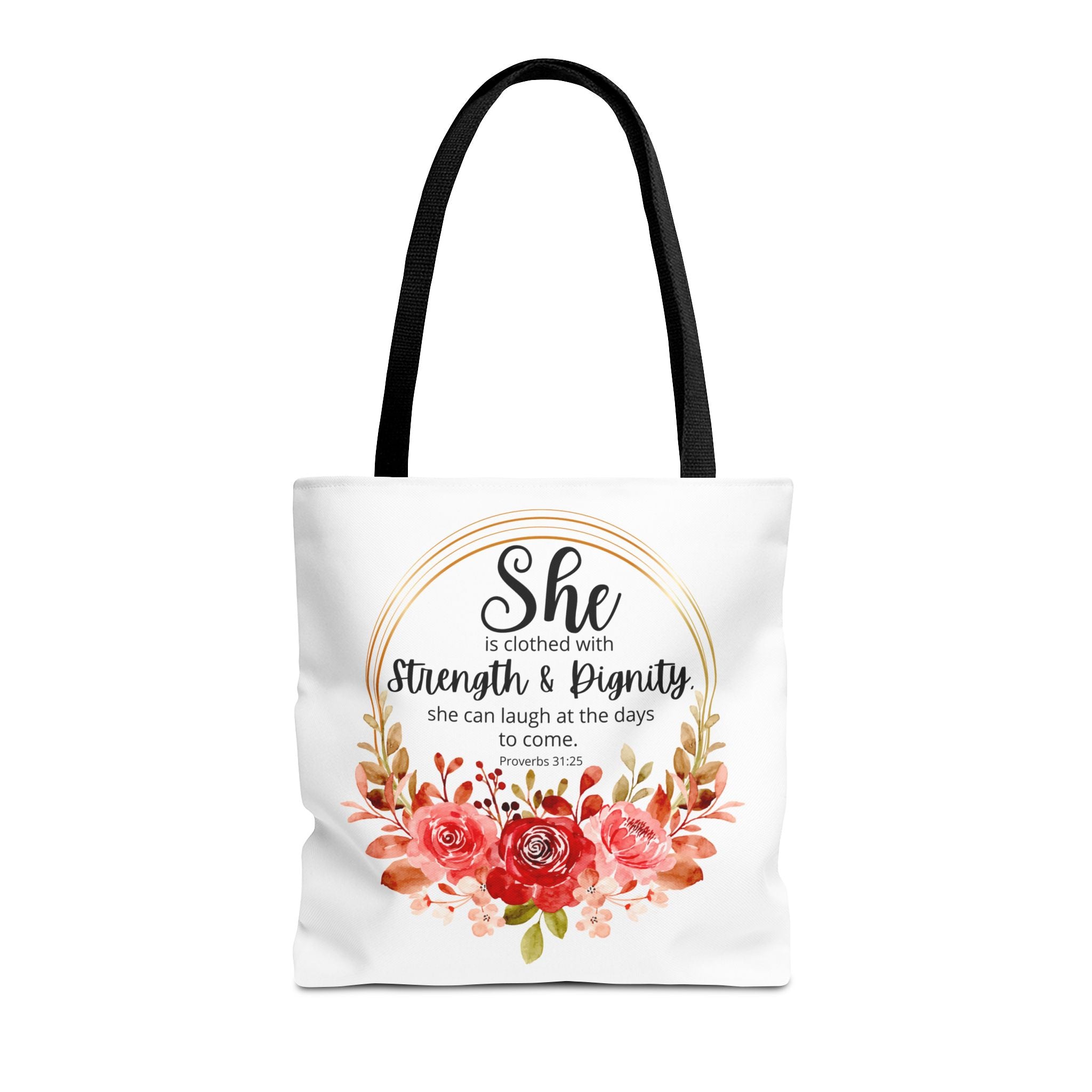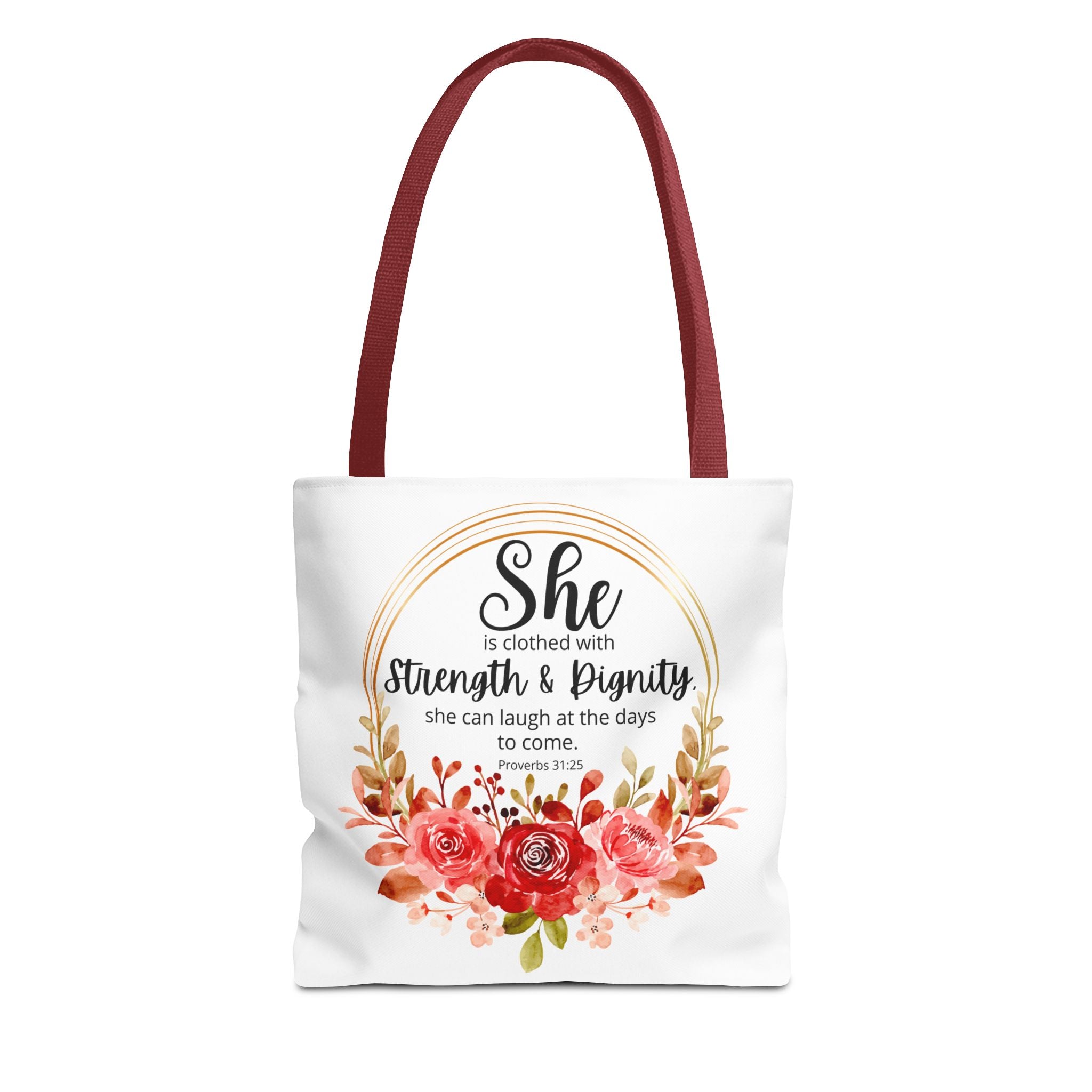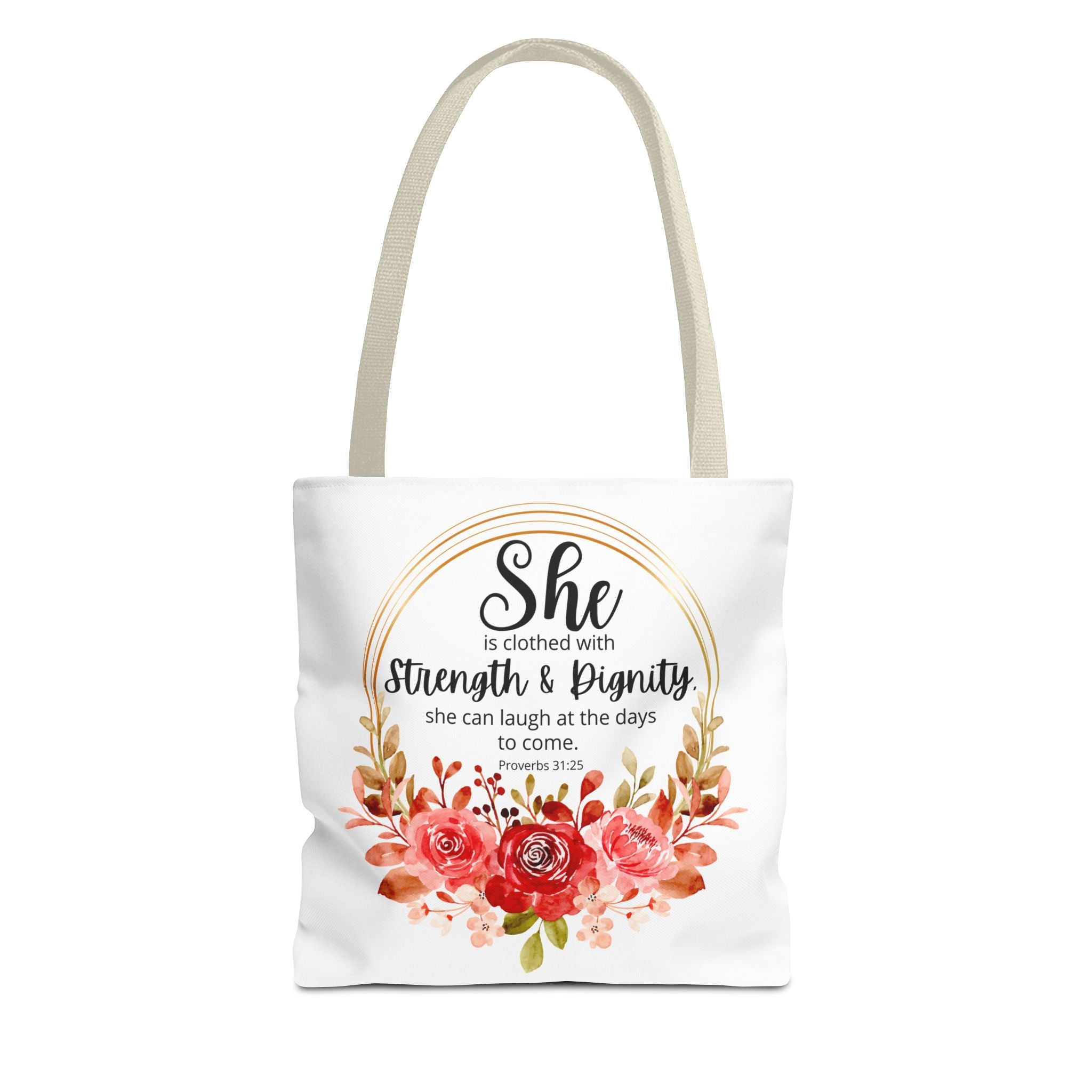 Carry your faith with the Proverbs 31:25 tote bag, a thoughtful gift for Christmas or any occasion. Perfect for Bible study, journaling, or daily errands, this versatile bag is available in three sizes with five handle color options for a personalized touch.